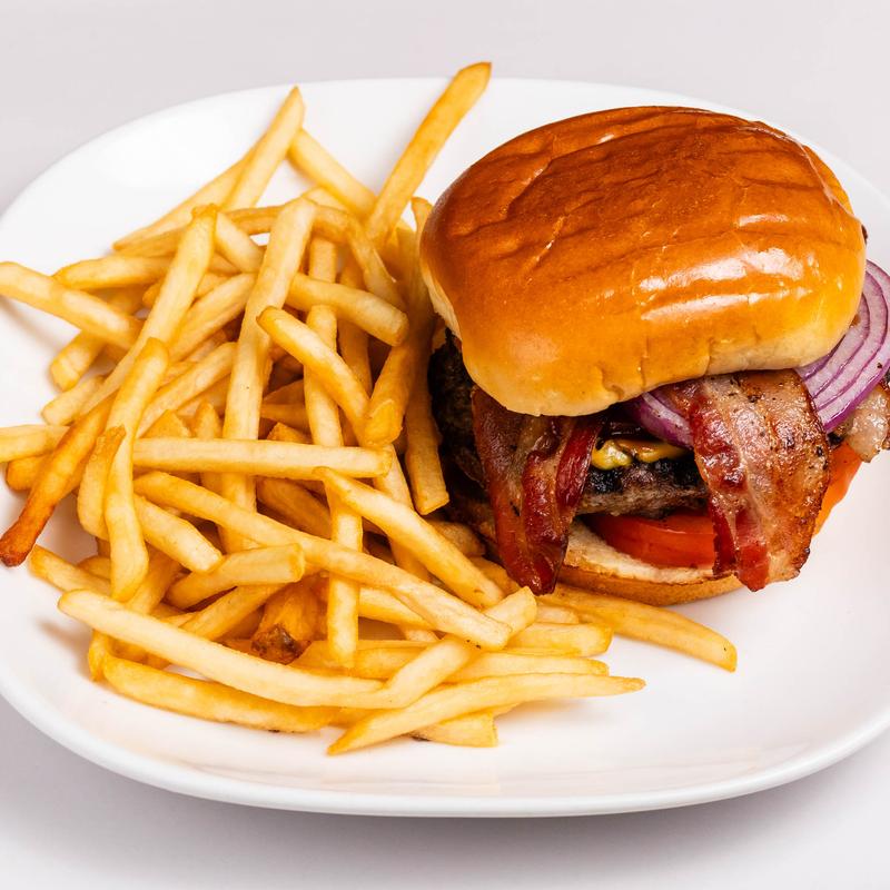Charbroiled with bacon, Swiss, lettuce, tomato, mushrooms, onion, and mayo.