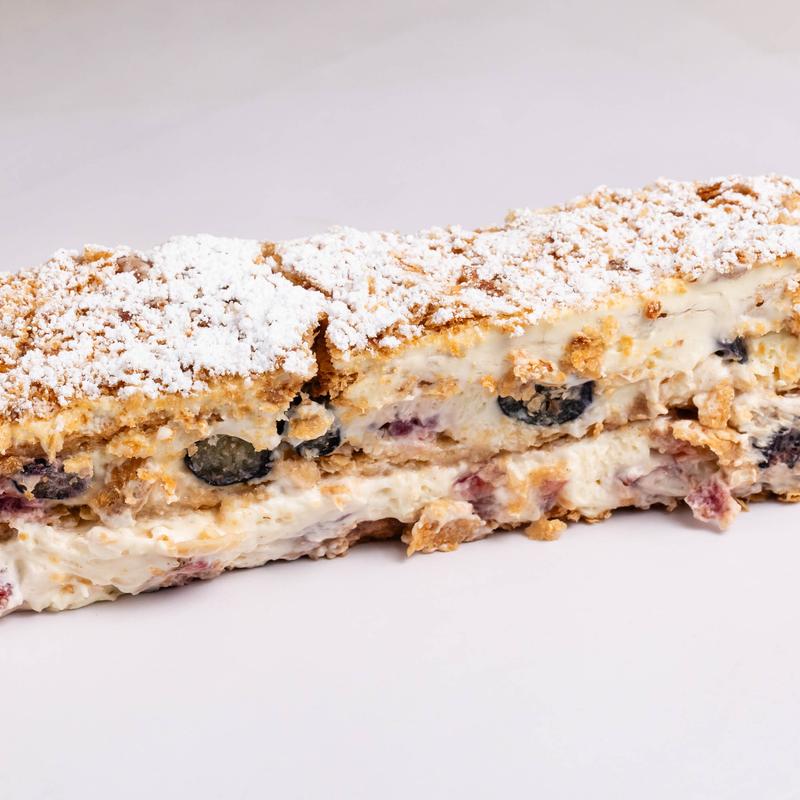 Layers of white sponge cake, vanilla custard, almond flavor, fresh chantilly cream.