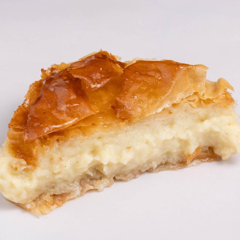 Thin layers of flaky phyllo, vanilla custard, powdered sugar.