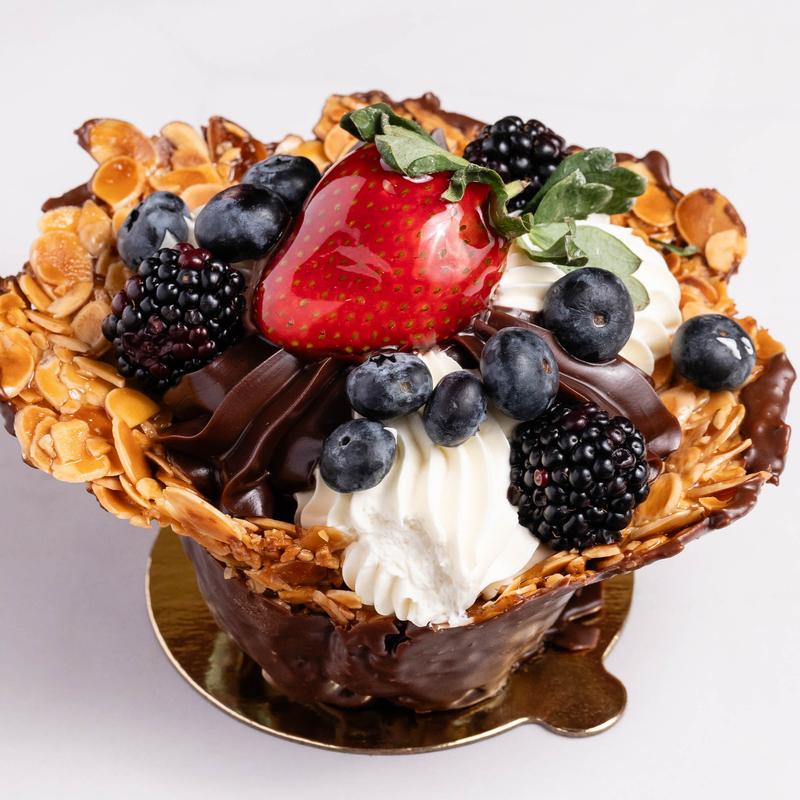 Chocolate caramel almond cluster filled with custard cream, mixed fruits, chantilly cream.