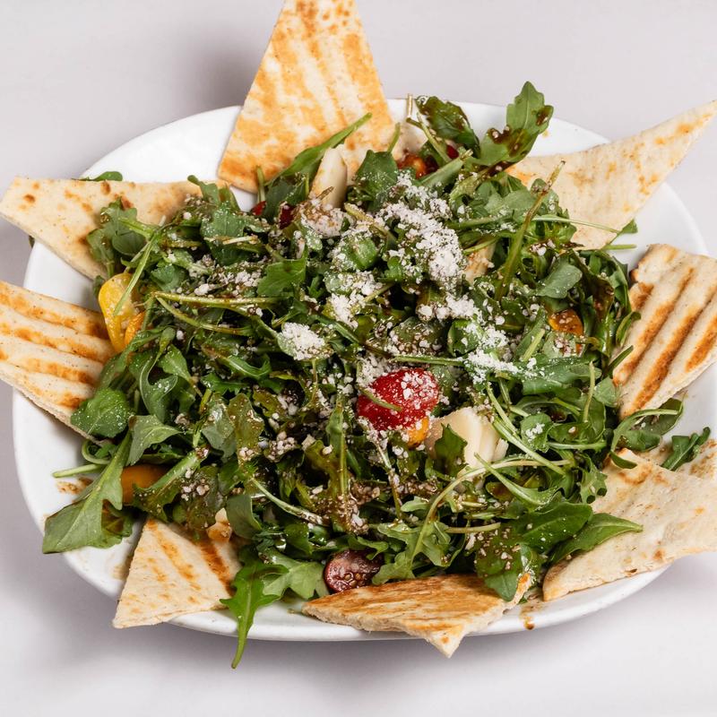 Arugula, Parmesan, cherry tomatoes, walnuts, and balsamic vinaigrette.